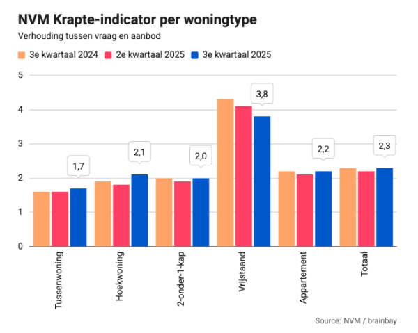 De NVM krapte-indicator is dit kwartaal 2,3. Dit is de verhouding tussen aanbod en aantal verkopen en geeft een indicatie van hoe krap de markt is. Dit zegt iets over de keuzeruimte. Pas boven de 5 is sprake van een evenwichtige markt; de huidige markt is dus nog steeds erg krap. Het hogere aanbod bracht weinig verandering in de krapte-indicator, omdat de woningen die op de markt komen ook snel weer worden verkocht. Deze dynamiek zorgt er wel voor dat – ondanks de krapte op de markt – meer mensen een huis kunnen kopen. Door het lage aanbod aan vrijstaande woningen daalde de krapte-indicator daar van 4,3 naar 3,8. Bij de andere woningtypen blijft deze gelijk of neemt zelfs iets toe.