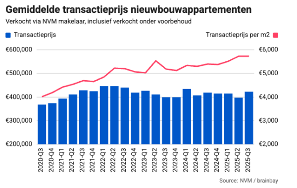 De gemiddelde transactieprijs van een nieuwbouwappartement is dit kwartaal gemiddeld 425.000 euro, een vergelijkbaar bedrag als in 2021. Toch zijn appartementen relatief duurder geworden door een sterke afname van de woonoppervlakte. In 2021 kreeg een koper voor dit bedrag gemiddeld 94 m², in 2025 nog slechts 73 m². Dit is een daling van 22%. Dit geeft een hogere vierkante meterprijs: in vier jaar tijd steeg dit met ruim 1.000 euro naar 5.700 euro. Dit heet ‘krimpflatie’. Het verklaart waarom gemiddelde verkoopprijzen stabiel blijven, terwijl de prijs per vierkante meter fors stijgt. Ontwikkelaars verkleinen woningen en buitenruimtes om nieuwbouw – ondanks stijgende bouwkosten – betaalbaar te houden. Zo gingen balkons van appartementen in vier jaar terug van gemiddeld 11 m² naar 8 m².